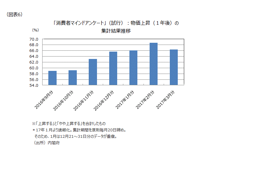 足もとの日経CPI Now T指数が弱含んでいるため、家計の予想物価上昇率は3月分でもたついた感もあるが、昨年秋からは上昇傾向にある(図表6)。日銀の物価目標にははるかに遠いものの、デフレ脱却は着実に進展している感じだ。