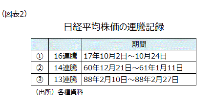 (日経平均株価が「16」連騰、連続上昇の最長記録を更新。月初の上昇連続記録は継続中、11月で「17」に)