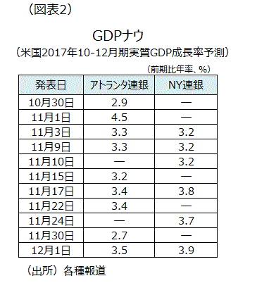 米国景気も、足もとは予想以上にしっかりした実質GDP成長率が続いている。前期比年率ベースで4~6月期+3.1%、7~9月期+3.3%で、アトランタ連銀やニューヨーク連銀のGDPナウによると、10~12月期も3%台の見込みである(図表2)。