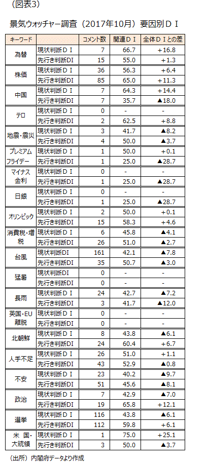 「景気ウォッチャー調査」10月調査でコメント数が特に多かったのは「台風」と「選挙」である。ちなみに9月調査では核実験などを受け増加した「北朝鮮」のコメント数は10月調査では減少し、先行き判断DIは60.4と、なんと50を上回った(図表3)。「北朝鮮問題はあっても・・・」というコメントが増え不安感が低下したことがわかる。11月29日に北朝鮮はアメリカ全土を射程に収める新型のICBMの「火星15」を発射した。「景気ウォッチャー調査」11月調査の回答期間の最後の2日間で北朝鮮に関する材料が景気ウォッチャーの景気判断にどんな影響を及ぼしたか12月8日の発表が待たれる。