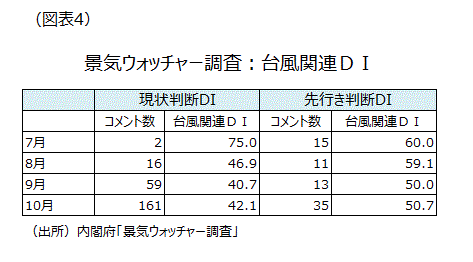 「景気ウォッチャー調査」10月調査の現状判断で「台風」についてのコメント数は、台風の被害の影響が大きくなった9月、10月と増加した。10月では161件と有効回答数の9%になった(図表4)。「やや悪くなる」54人+「悪くなる」13人は、「やや良くなる」25人+「良くなる」2人を上回り、台風関連DIは42.1と50を下回った。寄与度計算から0.7ポイント全体のDIを押し下げたことがわかる。一方、先行き判断では台風関連DIは50.7になり、「台風」の影響が一過性になりそうなことがわかる。台風が10月に上陸する年はあまりない。平年の上陸数は0.2個にとどまるが、今年は1個上陸、1回接近するという異例の事態だった。