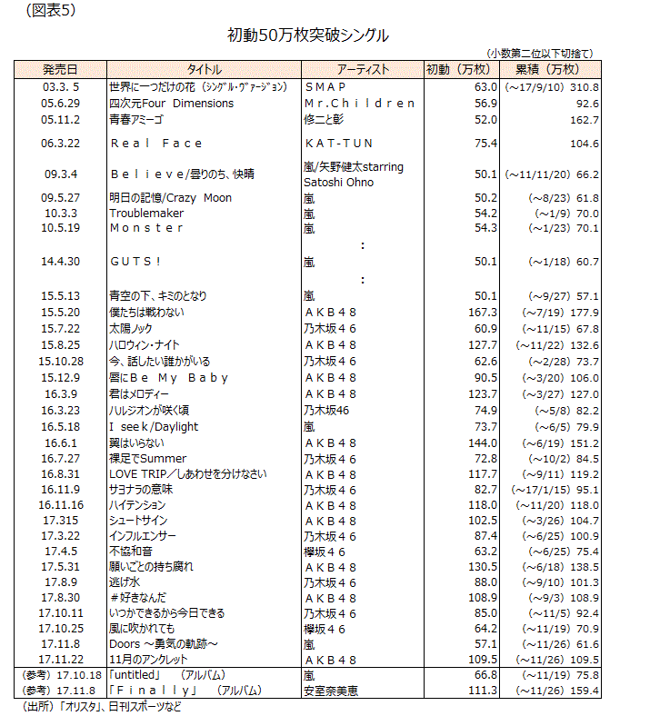 今年10~11月シングルCD初動売上50万枚超は2曲ずつで景気拡張局面継続を示唆した。「嵐」は、10月のアルバム「untitled」、11月のシングル「Doors ~勇気の軌跡~」がともに初動売上50万枚超と好調である(図表5)。09年以降17年まで連続して初動50万枚の記録をつくった「嵐」のシングルCD初動売上は、消費の底堅さを示唆している。