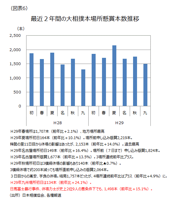 (九州場所は元横綱・日馬富士の暴行事件にもかかわらず、懸賞本数は5場所連続・前年同場所比で増加)