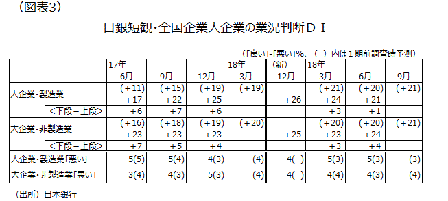 6月調査日銀短観では、大企業・製造業の業況判断DIが+21程度と3月調査の+24から3ポイント低下した。12年12月調査以来5年半ぶりの2四半期連続の悪化で16業種中、鉄鋼や非鉄金属など10業種が低下した。3月調査時点から円相場は円安・ドル高方向に進んだものの、資源価格上昇に伴う原料高の影響や米国のトランプ政権による保護主義政策などの影響が悪材料として出た。但し、21期連続して「良い」超のプラスであり、息の長い緩やかな景気拡張局面が継続していることを示唆する数字と言えよう。6月調査の大企業・製造業の業況判断DI+21は3月調査の「先行き」見通し+20より1ポイント改善した。足元の景況感が予測よりは良かったということだ(図表3)。大企業・製造業の「先行き」業況判断DIをみると、+21と「最近」の+21と同水準が見込まれている。6月調査の18年度想定為替レートは107円26銭で前回3月調査の109円66銭や、足元の実際の為替の動き(1ドル=110円台程度)より円高に置いている。このため、為替レートの今後の動向次第では業況判断DIが上振れることも予想される。