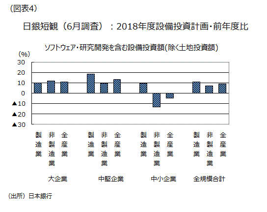 6月調査の18年度の大企業・全産業の設備投資計画・前年度比は+13.6%。一方、18年度の中小企業・全産業の設備投資計画・前年度比は▲11.8%だった。18年度の全規模・全産業の設備投資計画・前年度比は+7.9%になった。6月調査としてはしっかりした計画と言える。ソフトウェア投資額と研究開発投資額は、18年度計画・前年度比は製造業・非製造業と大企業・中堅企業・中小企業を掛け合わせた6カテゴリー全てで増加となっている。このためGDPの設備投資の概念に近い「ソフトウェア・研究開発を含み土地投資額を除くベースの全産業・全規模の設備投資」の18年度計画・前年度比は大企業・全産業で+11.0%、中小企業・全産業で▲4.7%だった。全規模・全産業では+9.1%になった。18年度は設備投資の伸びが期待される(図表4)。