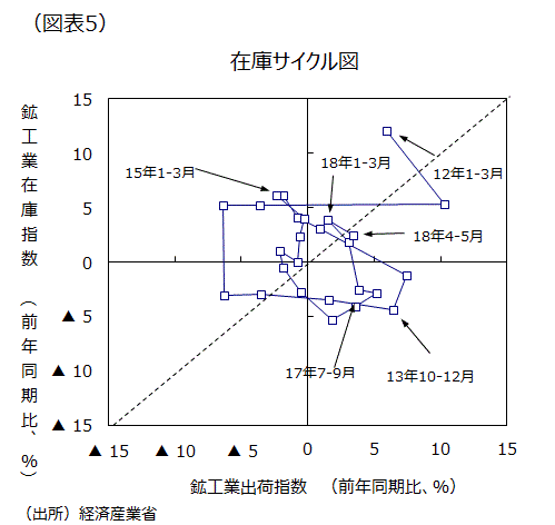 鉱工業生産指数・5月分速報値・前月比は▲0.2%と4カ月ぶりの減少になった。一方、前年同月比は+4.2%で19カ月連続の増加になった。大きな動きをチェックするために、鉱工業全体で縦軸に在庫の前年比を、横軸に出荷の前年比をとった在庫サイクル図をみると、18年1~3月期では出荷の前年比が+1.5%、在庫が同+3.9%と一時的に「在庫積み上がり局面」に入っていたが、18年4~5月分では出荷の前年比が+3.4%、在庫が同+2.5%と「在庫積み増し局面」に戻っている(図表5)。