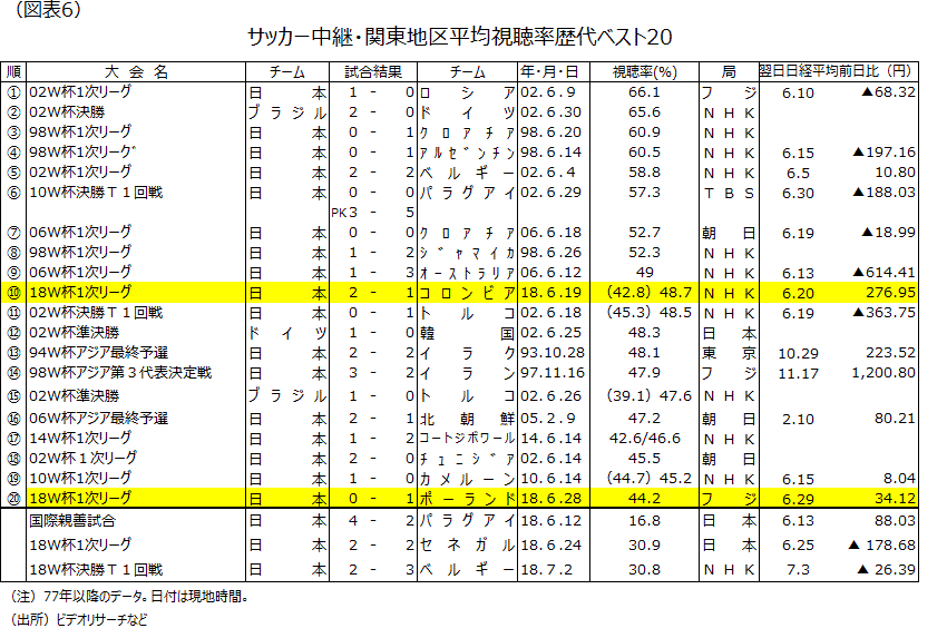 スポーツでは、ロシアW杯で日本は決勝トーナメント1回戦でFIFAランキング3位のベルギーと対戦、一時2-0でリードしたが、惜しくも逆転負けとなった。今回の日本代表への期待は、開幕前は大きくはなかったが、下馬評を覆し西野ジャパンが活躍したことで盛り上がった。深夜の試合となったが、6月19日の第1戦のコロンビア戦2-1で勝ち前回ブラジル大会でのリベンジを果たした。この視聴率(ビデオリサーチ・関東地区)は48.7%とサッカー中継歴代10位の高視聴率を記録し、翌日20日の日経平均は276円上昇した。株価がもたついた6月後半での最大の上げ幅を記録した(図表6)。ロシアW杯での日本代表の下馬評を覆す活躍は国民に元気を与えたと思われる。