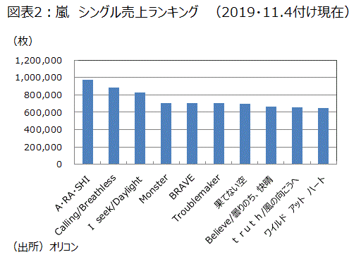 また、ラグビーワールドカップ関連のCDも売れた。11月4日付オリコンシングル売上ランキングで、日本テレビ系列テーマソング・嵐の「BRAVE」は70.6万枚売れている。現在70.7万枚だった自身の第4位だった売上に次ぐ第5位になっている(図表2)。また、7~9月期に放映されたラグビー部を舞台にしたドラマ「ノーサイド・ゲーム」の主題歌、米津玄師の「馬と鹿」は週間2.4万DLを記録し、11/11付オリコン週間デジタルシングル(単曲)ランキングで2位にランクイン。累積売上を68.1万DLとし、同ランキングの「歴代累積DL数記録」でDA PUMP「U.S.A」を上回り2位に上昇。1位の自身の曲「Lemon」と併せ、1位、2位を独占することとなった。