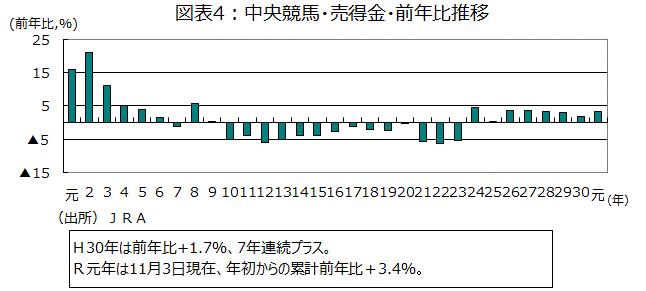 他の身近なデータも、景気の底堅さを示唆するものが多い。例えば、JRA中央競馬会の年初からの売得金は11月3日現在前年比+3.4%で、8年連続前年比プラスに向けて推移している(図表4)。雇用の限界的な関連指標と言える自殺者数は、7月の前年同月比が+2.7%と5カ月ぶりに一時増加に転じたものの、8月は同▲8.6%、9月が同7.2%と再び減少傾向に戻り、1~9月の累計前年比は▲3.4%と10年連続の減少に向けて推移している。金融機関の店舗強盗件数は9月20日までで6件と18年同時期の13件の半分未満にとどまっている。17年は26件、18年は17件だったが、19年はさらに減少が見込まれる状況である。