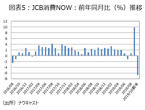 消費税増税前の駆け込み需要とその反動は今回も高額品を中心にそれなりに出たようだ。全国百貨店売上高の9月の前年同月比は+23.1%と、7月同▲2.9%、8月の同+2.3%から大きく増加した。中でも美術・宝飾・貴金属は前年比で+102.9%と倍以上の売上高となった。一方、10月の前年同月比には予想通り駆け込みの反動が出た。大手百貨店5社の売上高前年同月比の単純平均は9月が+26.8%の増加だったが、10月は▲18.6%の減少になった。台風による店舗休業や営業時間の短縮も影響し、2014年4月の増税時よりも下げ幅が大きかった。ナウキャストのJCB消費NOWの前年同月比は、9月が+9.831%と8月の+0.941%から大きく増加したが、10月前半は▲6.706%とマイナスに転じた(図表5)。乗用車新車新規登録届出台数の前年同月比は、9月が+13.6%と8月の+4.9%から増加率を高めたが、10月▲25.1%と大幅なマイナスに転じた。