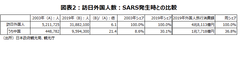 SARSが流行した2003年時点で、中国のGDPの世界に対するシェアは4%だったが、2018年には16%と大きくなっている。訪日外国人は2019年に3,188万人で、2003年の6.1倍になったが、中国人は959万人と同期間に21.4倍になった。2019年の中国人の旅行消費額は1兆7,718億円と全体の37%を占めている(図表2)。景気ウォッチャー調査を使って2003年の「SARS」関連コメントDIの推移をみると、SARSに関するコメントは3月調査で初めて登場し、5月調査が現状125、先行き188と最もコメント数が多かったが、SARSが終息方向に向かうとコメント数が減少し9月調査では1桁に低下した(図表3)。「SARS」関連現状判断DIは3月~6月までは景気判断の分岐点の50を下回っていたが、7月・8月では60台まで上昇した(図表4)。SARSのマイナスの影響が2003年当時は比較的短期間で小さくなっていたことがわかる。2020年ではサプライチェーンやインバウンドなどの影響が当時よりも大きいことには留意する必要があろう。