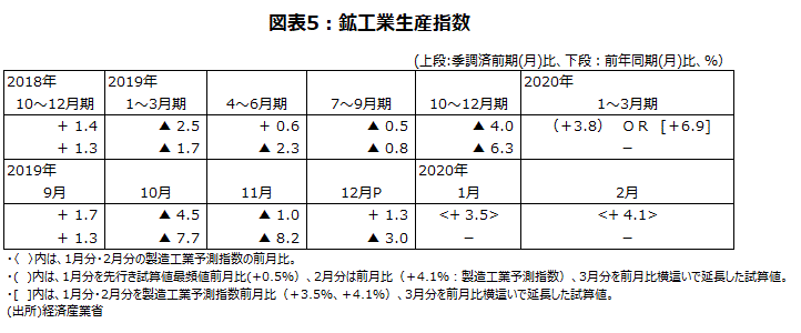 鉱工業生産指数・12月分速報値・前月比は+1.3%と3カ月ぶりの増加になった(図表5)。12月分鉱工業生産指数では、生産用機械工業、汎用・業務用機械工業、電子部品・デバイス工業等6業種が前月比増加した。生産用機械工業は10月、11月と2カ月連続で大きく減少したが、海外向けで増加した品目や、10月の台風の被災の影響を受けた品目の生産復旧もあり、12月は大幅な増加となったということだ。自動車工業、輸送機械工業(除.自動車工業)、窯業・土石製品工業等の9業種が前月比減少となった。