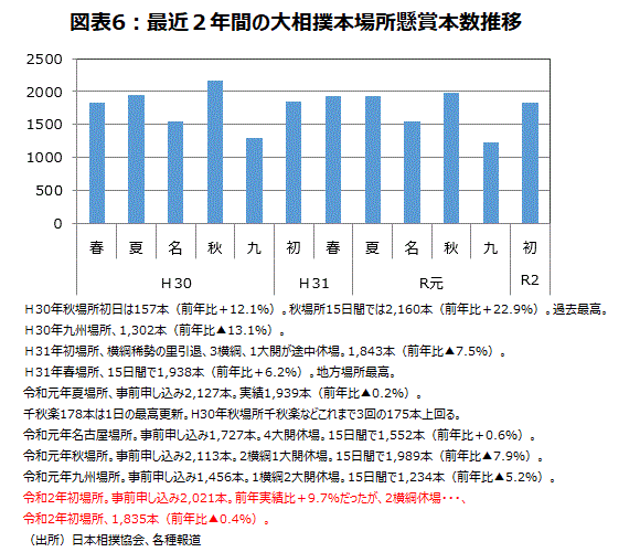 最近の身近なデータは比較的明るいものが多いようだ。ジャニーズ史上初となる同時CDデビューを果たしたSixTONESとSnow Manのデビューシングル、SixTONES vs Snow Man「Imitation Rain/D.D.」の初動売上が132.8万枚となり、ミリオンを達成した。ジャニーズ・グループのデビューシングルでこれまで最高の初動売上だったのは2006年のKAT-TUN「Real Face」75.4万枚だったので、これを抜く新記録となった。初動50万枚のシングルCDが出ているときは景気拡張局面となる傾向がある。昨年まで8年連続前年比増加となった中央競馬の売得金は2月2日までの累計前年比で+2.3%の増加となっている。大相撲初場所の懸賞本数は1,835本と前年同場所比▲0.4%と減少になってしまったが、事前申し込みは2,021本だった(図表6)。両横綱が早々に休場してしまった影響があろう。千秋楽結びの一番は、前頭17枚目の徳勝龍が大関貴景勝に勝ち初優勝を決めた取り組みになったが、かかった懸賞は60本で前年初場所の結びの一番の59本より多かった。両横綱休場という特殊要因を除くと基調は底堅いということを示唆する数字と言えそうだ。