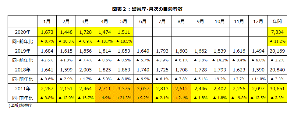 新型コロナウイルス感染拡大対応としての経済活動自粛の影響が完全失業率の上昇要因になった。完全失業率5月分は2.9%(2.88%)、直近ボトムの19年12月の2.2%(2.19%)から5カ月連続上昇してきたが、2%台はキープしている。完全失業率と警察庁「自殺統計」の自殺者数の相関係数を、共通データがある78年~19年で算出すると、0.912と高い。経済生活問題を理由とした自殺も多いからだろう。一部で増加が懸念された5月分の自殺者数は暫定値で1,511人、前年比▲18.5%となった。年初からの累計は7,834人、前年比▲11.2%である(図表2)。また、5月の刑法犯総数は前年同月比で3割強減少している。現在、雇用悪化、自殺者の増加といった事態を回避するための雇用調整助成金の拡充などの政策がそれなりに効いているとみられる状況だ。