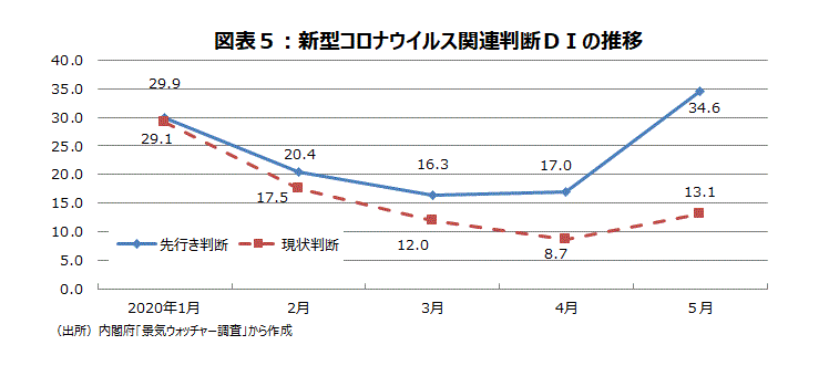 新型コロナウイルス関連・現状判断DIを作成すると、4月に8.7と3月の12.0から1ケタに下落したが、5月には13.1に戻った。4月にいち早く底打ち感が出ていた新型コロナウイルス関連・先行き判断は3月16.3から4月17.0、5月34.6に上昇している(図表5)。なお、5月の新型コロナウイルスのコメント数は現状661名、先行き651名と依然多いものの、最多だった3月の現状998名、先行き1,086名に比べどちらも減少し落ち着きをみせた。