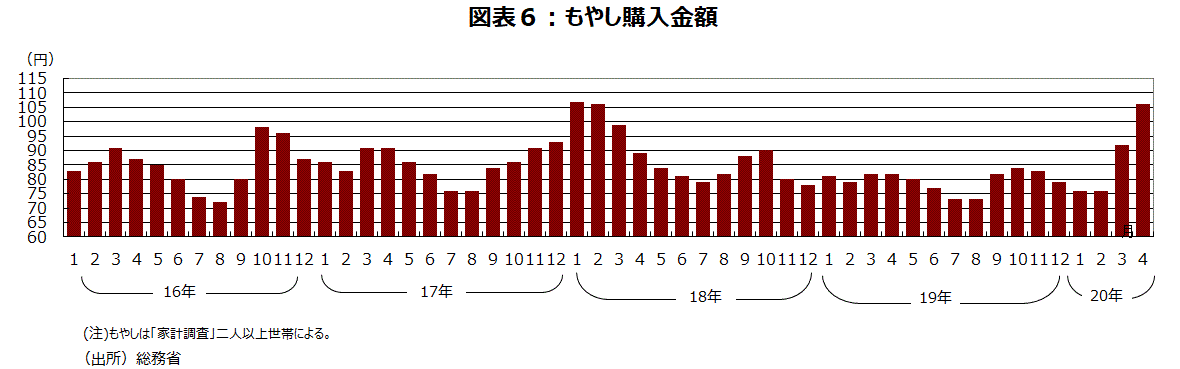 他の野菜が高い時や、消費者の節約意識が高まると購入金額が増える傾向がある、もやしは、20年3月分は92円で1月分・2月分の76円から増加し18年3月分の99円以来の購入金額になった。4月分では前年の天候の影響で野菜が高かった18年2月分と並ぶ106円と2年ぶりの高水準になった(図表6)。