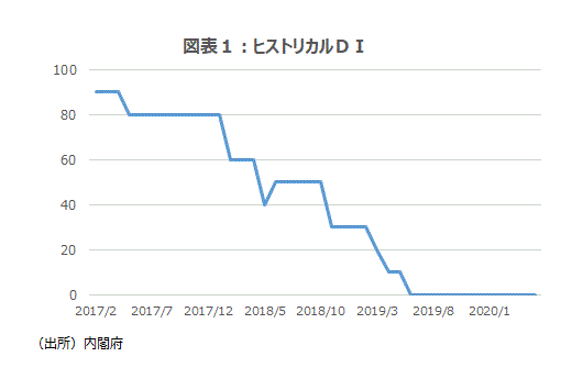 2012年12月から始まった景気の拡大局面は18年10月を暫定的な山として終了し、後退に転じたと内閣府が認定した。ヒストリカルDIは18年11月に景気判断の分岐点50を下回った(図表1)。景気の拡大期間は71カ月にとどまり、戦後最長だった「いざなみ景気」(02年2月~08年2月)の73カ月には届かなかった。企業部門は好調だったが人手不足経済と言われながらも、賃上げの勢いは鈍く個人消費が盛り上がりを欠いた景気拡張局面だった。この間の経済成長率は年平均+1.1%にとどまった。