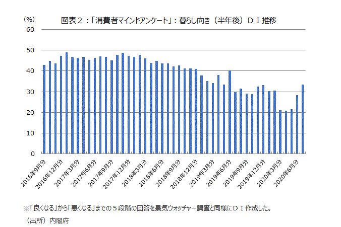 4月「消費動向調査」の消費者態度指数(二人以上の世帯、季節調整値)は前月比9.3ポイント低下し、21.6だった。調査方式が異なるが、リーマン・ショックの影響が残る09年1月(27.5)を下回り、過去最低を更新した。しかし、5月調査では24.0、6月調査では28.4、7月調査では29.5と緩やかながら3カ月連続改善した。また、内閣府「消費者マインドアンケート調査」で、暮らし向き(半年後)の5段階の回答から「景気ウォッチャー調査」と同様な手法により判断DIを作成すると、4月分は20.7と16年9月からある統計史上で最低水準になった。全員が「やや悪くなる」と回答した時のDIである25.0を下回っていた。しかし、4月を底にして、5月21.5、6月28.4、7月は33.4へと上昇した(図表2)。