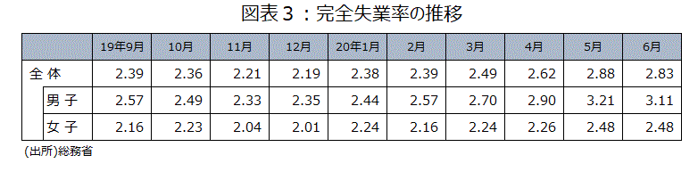 新型コロナウイルス感染拡大対応としての経済活動自粛の影響が完全失業率の上昇要因になり、5月分は2.9%(2.88%)、直近ボトムの19年12月の2.2%(2.19%)から5カ月連続上昇した。しかし、6月分は2.8%(2.83%)に若干鈍化し依然2%台はキープしている(図表3)。完全失業率と警察庁「自殺統計」の自殺者数の相関係数を、共通データがある78年~19年で算出すると、0.912と高い。経済生活問題を理由とした自殺も多いからだろう。一部で増加が懸念された6月分の自殺者数は暫定値で1,519人、前年比▲7.4%となった。年初からの累計は9,429人、前年比▲9.9%である。また、1~6月分の刑法犯総数は前年同月比▲15.6%、6月分は同▲15.4%と減少している。現在、雇用悪化、自殺者の増加といった事態を回避するための雇用調整助成金の拡充などの政策がそれなりに効いているとみられる状況だ。