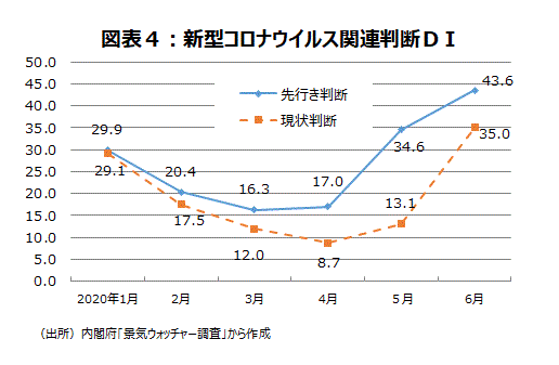 新型コロナウイルスに関するコメントをした景気ウォッチャーの回答だけを使い、新型コロナウイルス関連・現状判断DI、先行き判断DIを独自に作成すると、新型コロナウイルス関連・現状判断DIは4月には8.7と3月の12.0から1ケタに下落したが、5月に13.1に、6月には35.0に戻った。一方、新型コロナウイルス関連・先行き判断はいち早く底打ち感が出ていた。3月16.3を底に6月43.6へ上昇している(図表4)。なお、6月の新型コロナウイルスのコメント数は現状553名、先行き702名と依然多いものの、最多だった3月の現状998名、先行き1,086名に比べどちらも減少している。