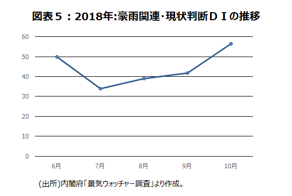 6月調査では豪雨に関するコメントはなかった、梅雨に関するコメントも、現状・先行き各2件ずつしかなかった。平成30年7月豪雨の時は7月調査での豪雨のコメント数が175、豪雨関連現状判断DIが33.9となり、景況感に悪影響を及ぼした(図表5)。令和2年7月豪雨の影響は8月11日発表の7月調査に現れると思われるが、どういう結果になるか注目される。