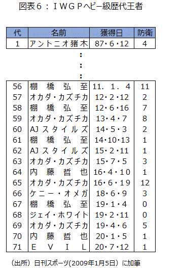 そこでの主役のひとりが、キング・オブ・ダークネス・EVIL(本名、渡辺高章)だ。それまでは所属ユニットのロス・インゴベルナブレス・デ・ハポンで4番手とみなされていた。32人が参加したトーナメントNEW JAPAN CUPの2回戦後「新しい新日本」とマイクアピール。生中継された準決勝で当時所属していたユニットの同僚、SANADAを容赦なくパイプ椅子攻撃などの反則など手段を選ばすに撃退。7月11日の決勝で実質的な新日本プロレスのエースであるオカダ・カズチカも破り、NEW JAPAN CUP初優勝を果たした。それまで所属していたロス・インゴを裏切りバレットクラブにユニットを鞍替えした。翌日、内藤哲也の持つIWGP ヘビー級、IWGPインタコンチネンタルのダブルタイトルに挑戦。急所蹴りやセコンド乱入など手段を選ばず、それまで所属していたロス・インゴのリーダーの内藤から、タイトルを奪取した。7月25日にはIWGP Jr ヘビー級王者の高橋ヒロムの挑戦を退け、2冠の初防衛に成功した(図表6)。