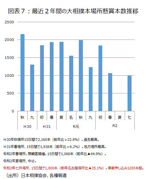 大相撲七月場所の懸賞は1,000本になった。昨年7月に開催された名古屋場所1,552本との比較で▲35.6%となった。事前申し込みでも1,200~1,300本程度と報じられていたが、それを下回った。新型コロナ感染症の影響で企業も広告費を削減する傾向にあるところに加え、両横綱休場などの影響で弱含んだ(図表7)。