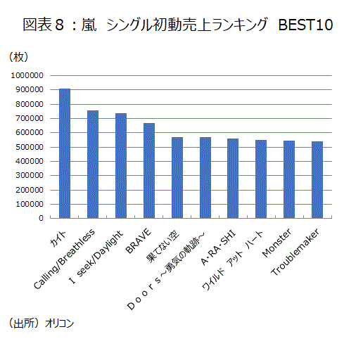 ジャニーズの人気グループKing & Princeが6月10日にリリースした最新シングル「Mazy Night」は初動51.8万枚と50万枚超となり、6月が景気拡張局面に入った可能性があることを示唆する数字となった。ジャニーズ勢のCDの初動50万枚超が続いている。7月22日発売のSixTONES「NAVIGATOR」が62.2万枚、7月29日発売の嵐「カイト」が91.1万枚を記録した。嵐のこれまでの初動売り上げの自己最高だった2013年発売の「Calling/Breathless」(75.6万枚)を更新した(図表8)。嵐のシングル曲で最も売れたのは、デビュー曲「A・RA・SHI」で97.3万だが、同曲はすでに廃盤になっている。通常版にカップリング曲として、昨年 11 月の『天皇陛下御即位をお祝いする国民祭典』で披露された奉祝曲「Journey to Harmony」も収録されている。活動休止まで残り5カ月を切った嵐だが、初のミリオン達成となるかが注目される。
