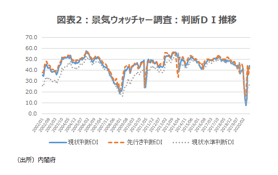 景気に敏感な立場にいる人々の意見を毎月25日から月末にかけて聞く「景気ウォッチャー調査」は4月に各判断DIが統計開始以来の最低を記録した。現状判断DIは7.9だった。その後、5月15.5、6月38.8、7月41.1、8月43.9と、全員が「変わらない」と答えた場合の50を下回っているものの、持ち直しの動きがみられる。また、2~3カ月先の景気の先行きに関する先行き判断DIは4月の16.6から6月では44.0まで戻していたが、新型コロナウイルス感染者の増加から先行き懸念が台頭した7月に36.0に一時低下したが、8月に42.4に戻した(図表2)。