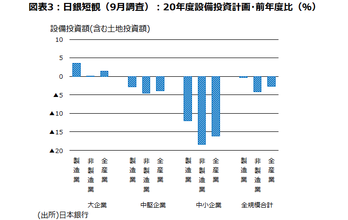 但し、厳しい景気状況を示唆する数字も見られた。売上高や経常利益の20年度の計画の前年同期比をみると、修正率がマイナス傾向で依然厳しい状況が継続している。9月調査の20年度大企業・全産業の設備投資計画・前年度比は+1.4%と6月調査の+3.2%から下方修正になった。一方、20年度の中小企業・全産業の設備投資計画・前年度比は▲16.1%と6月調査の▲16.5%から上方修正された。中小企業は調査の度に上方されるという傾向は維持されたが、改善幅は小幅だった。20年度の全規模・全産業の設備投資計画・前年度比は▲2.7%と6月調査の▲0.8%から下方修正となった。先行きの新型コロナウイルスの影響が読めない企業が設備投資に慎重になっている(図表3)。