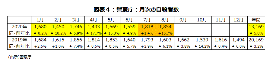1~8月分の刑法犯総数は前年同月比▲17.5%、8月分は同▲17.1%と減少している。これは良いデータだが、同じ警察庁発表のデータで心配なのは、自殺者数だ。新型コロナウイルスによるストレスが高まっていよう。19年8月分から20年6月分までは自殺者数の前年同月比は減少で推移してきたが、7月分で増加に転じた。7月分は1,818人、前年同月比+1.4%で、当初の同+0.1%から増加方向に改定され、8月分は1,854人、前年比+18.7%と大幅な伸び率になってしまった。新型コロナの影響が遂に顕在化してしまった可能性もある。最近、有名な芸能人の自殺が相次いでいることから、マスメディアの自殺報道に影響され自殺が増えるという「ウェルテル効果」が懸念される。但し、年初から8月分までの累計は13,169人、前年比▲5.0%である(図表4)。11年ぶりの増加になるかどうか予断を許さない状況である。