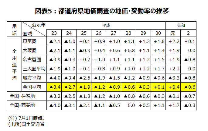 新型コロナウイルスの感染拡大が回復基調にあった地価に冷や水を浴びせた。新型コロナの影響を織り込んだ最初の大規模な地価調査である、今年の基準地価(7月1日時点)は、全国・全用途平均で前年比▲0.6%と3年ぶりの下落となった(図表5)。訪日客需要が消失し繁華街や有名観光地の地価を押し上げた。三大都市圏の商業地は昨年の+5・2%上昇が+0・7%の上昇に鈍化した。都心商業地が減速した。コロナ禍で在宅勤務が急速に広がり、郊外や地方で働く人も増えたが、まだ住宅地の地価を押し上げる勢いはみられない。逆に都心で働く人が減りオフィスの需給が緩んだ面があり、地価の押し下げ要因になっている面もあるようだ。
