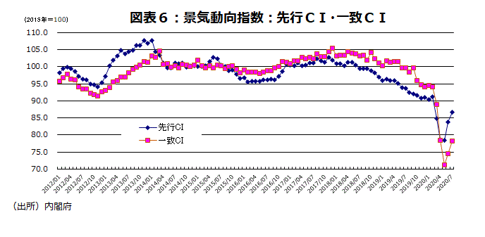 7月分景気動向指数で、一致CIは前月差+3.9と6月分の同+3.2に続き2カ月連続の上昇、8月分も上昇が予測される。景気の動きを量的に示す一致CIは、新型コロナウイルスの影響がなかった1月分の94.5に比べるとまだかなり低い水準にあるものの、5月分の71.2を底に7月分では78.3まで戻した(図表6)。景気局面は方向性で決まるので、上昇傾向が継続するかが今後の景気をみる上でのポイントになる。