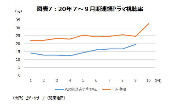 7~9月期の連続ドラマでは全話視聴率20%超、最終回に令和になっての最高視聴率32.7%を達成した「半沢直樹」に注目が集まったが、ハートフルなラブコメディーのドラマである「私の家政夫ナギサさん」も結果を出した。初回は14.2%だったが、回を重ねるごとに数字が上昇し、最終話は19.6%になった(図表7)。全話平均視聴率は15.1%で16年10~12月期の「逃げるは恥だが役に立つ」の14.6%を超えた。98年の金融危機時にブレークした「ショムニ」のような強い女性が主人公のドラマが流行るときは景気後退局面であることが多いが、心温まるラブストーリーが流行るときは景気拡張局面であることが多い。