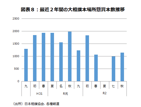 「倍返し」のセリフが有名の「半沢直樹」だが、今回のシリーズでは「恩返し」も話題になった。2016年の地震、今年の豪雨と災害に見舞われた故郷熊本への恩返しを胸に、大相撲秋場所で初優勝したのは関脇の正代だった。場所後、熊本県出身の初の大関に昇進した。両横綱が初日から休場した秋場所の懸賞本数は1,152本、前年比▲42.1%と前年に比べると厳しい数字であったが、同じ両国国技館で開催された七月場所の1,000本からは増加した(図表8)。