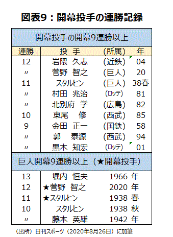 巨人菅野智之投手が、開幕投手からの連勝を12に伸ばした。巨人では38年春のスタルヒンの11連勝を82年ぶりに更新した。プロ野球全体では、2004年に岩隈(当時近鉄)がマークしたプロ野球記録に並んだ(図表9)。ちなみに04年は景気拡張局面だった。今年のペナントレースは最も人気のある巨人に9月15日マジック38が点灯、その後マジックは順調に減り10月1日現在でマジック21になった。貯金のかなりの部分は菅野投手の貢献によるものだ。