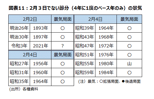日本最初の資本主義的な恐慌は「明治23年恐慌」であるといわれる。元関西学院大学経済学部長の故・田村市郎氏によれば、明治25年11月を谷とする戦前の最初の景気循環局面で1893年(明治26年)と1897年(明治30)年の節分は、日清戦争好況を含む拡張局面だった(図表10)。また、1956年(昭和31年)から1984年(昭和59年)まで4年に1度のペースで生じた2月4日の節分が景気後退局面になったことは一度もない(図表11)。次に、4年に1度のペースで節分が2月3日でなくなるのは2025年。大阪万博開催という景気にとって明るい材料がある年の節分は2月2日だ。“通常の2月3日でない節分”は後退局面にならないというジンクスが124年ぶりの2月2日節分で生きて、2021年が景気拡張局面になることを期待する。新型コロナウイルスという鬼は、「鬼は外!」だ。