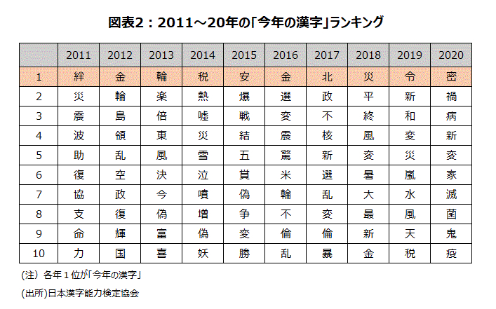 「今年の漢字」はそのときどきの景気局面や経済状況を映す。景気が良く明るいムードが社会に満ちているときは、前向きな意味の漢字が選ばれる傾向にある。2019年末の段階では、何事もなければ、2020年は東京オリンピックの年なので、今年の漢字は「金」の可能性が高いと思われた。調査期間直前の新潟中越地震や史上最多の台風10個上陸で「災」となった2004年や、リーマンショックの2008年の「変」のようなショッキングな出来事がない場合、2000年、12年、16年と夏季オリンピック開催年の漢字は「金」になっている。五輪の「金」メダルが注目されるようだ。しかし、東京オリンピックは2021年に延期になり、2020年の今年の漢字は新型コロナウイルス関連から選ばれ、「密」となった(図表2)。「密」はコロナ関連の漢字の中でも、予防策として語られることが多く、コロナ禍の「禍」や疫病の「疫」や「病」、感染の「染」などと比べ、「親密」などの使われ方からみて、どちらかと言えば暖かく前向きな感じがする面がある。幸い2020年は台風上陸や大きな地震発生がなかったので、コロナ関連としても「災」が選ばれることはなかった。鬼滅の刃に絡めて、コロナウイルス絶滅を期待した「滅」は7位にとどまり、人々は「密」を選んだ。
