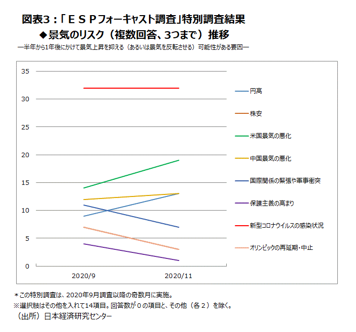 「ESPフォーキャスト調査」(11月の特別調査)で景気のリスクとして第2位の「米国景気の悪化」を大きく引き離し、ほとんどのフォーキャスターが指摘したのが「新型コロナウイルスの感染状況」だった(図表3)。