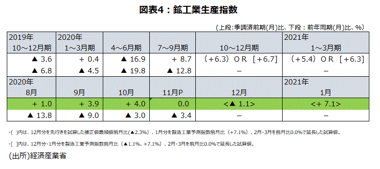 鉱工業生産指数・11月分速報値・前月比は0.0%と、6カ月連続上昇にならず、横ばいになった。季節調整値の水準は95.2で、20年3月の95.8にまだ届かない。自動車工業は部品不足などから6か月ぶりに低下したが、半導体製造装置などが寄与した生産用機械工業など15業種中9業種が前月比上昇となった。経済産業省の生産指数・基調判断は「生産は持ち直している」で据え置きとなった。12月分の生産指数は第3波の新型コロナウイルス感染拡大の影響もあって、もたつきそうだ。12月分生産予測指数・前月比は▲1.1%下降。経産省試算値は▲2.3%の下降である。但し、1月分生産予測指数・前月比は+7.1%の上昇と高めの伸びが見込まれている(図表4)。