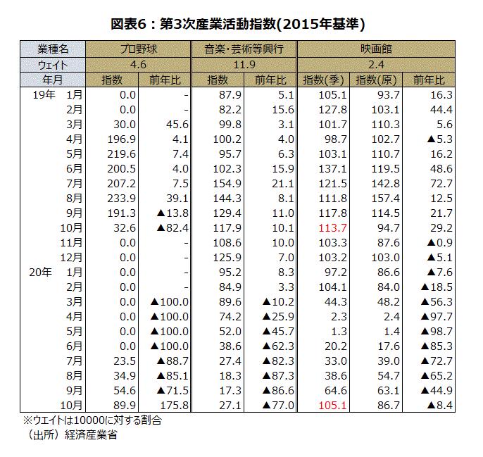 新型コロナウイルスの影響で第3次産業活動指数の映画館(ウエイト1万分の2.4)の前年同月比は5月に▲98.7%減まで落ち込み、8月分▲65.2%、9月分▲44.9%と2ケタの大幅減少が続いた。しかし『鬼滅の刃』が10月16日に公開されたことで映画館は息を吹き返し、10月分は▲8.4%と1ケタの減少率まで改善した。2015年を100とした10月分の季節調整値は105.1で、2019年10月の113.7以来の水準に戻した(図表6)。音楽・芸術等興行の10月分の季節調整値26.4の低水準、前年同月比が▲77.0%と依然大幅減少であることと対照的だ。