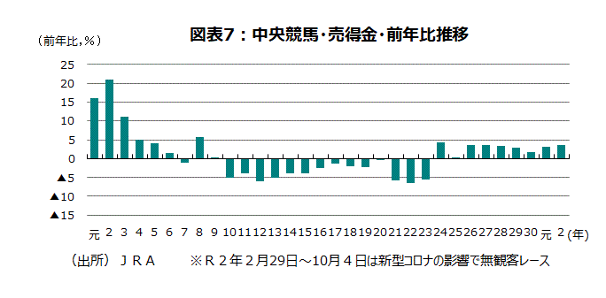 JRA(日本中央競馬会)の2020年の売得金・年初からの累計金額の前年比は新型コロナウイルスの影響で2月29日から(10月4日まで)無観客レースになったことから、5月3日の週までの累計では▲6.2%まで悪化した。しかし、コロナ禍の対応としてネットでの馬券販売で持ち直した。結果的に2020年は前年比+3.5%と9年連続の増加になった(図表7)。