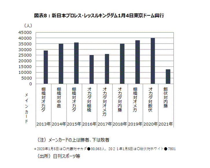 音楽・芸術等興行の11月分前年同月比が▲69.2%と6月以降▲50%以上の依然大幅減少率が続いていることと対照的だ。新日本プロレスの1.4東京ドーム大会も新型コロナウイルスの感染対策の入場制限があるため、入場者数の減少が顕著だ(図表8)。