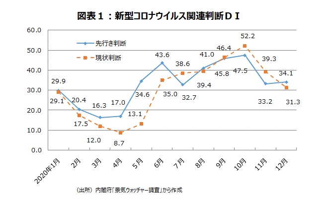 景気ウォッチャー調査では国内感染者が中旬に確認されたことから2020年1月調査から「新型コロナウイルス」が登場し、2020年の年間を通して「新型コロナウイルス」関連現状判断DIは全体の現状判断DIを下回り、足を引っ張る要因であった。一番多かった3月には998人と回答した景気ウォッチャー1,812人の55%が景況判断の根拠として「新型コロナウイルス」に関してコメントした。