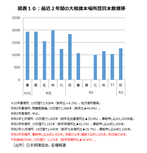 新型コロナウイルスの影響で令和2年の大相撲では、地方場所は無観客で実施された春場所のみで、それ以外は両国国技館で開催された。春場所の懸賞は1,068本懸かった。夏場所は中止、再開した7月場所は2週間延期で開催、当初の無観客の予定から上限を設けた有観客興行として行われた。9月場所は昨年コロナ禍で最高の1,152本の懸賞が懸かった。事前の申し込みは約1,300本だった。今年の初場所は 事前申し込み約1,400本。コロナに感染した力士が出た部屋は全員休場となったため休場力士多く、場所直前では約1,300本に減少となった。途中、人気の大関・貴景勝のケガによる休場もあり、結果として15日間で、1,270本懸かった。コロナ禍の開催場所としてはこれまでで最高となっている(図表10)。