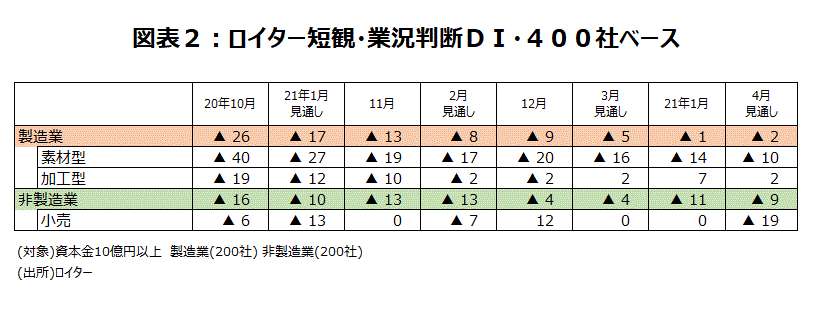 ロイター短観をみると、1月では製造業の業況判断DIは▲1と輸出・生産の持ち直し傾向を受けて12月の▲9から改善、加工業種が牽引している。一方、コロナ第3波の影響を大きく受けた非製造業は▲11と12月の▲4から悪化した(図表2)。明暗が分かれる動きだ。