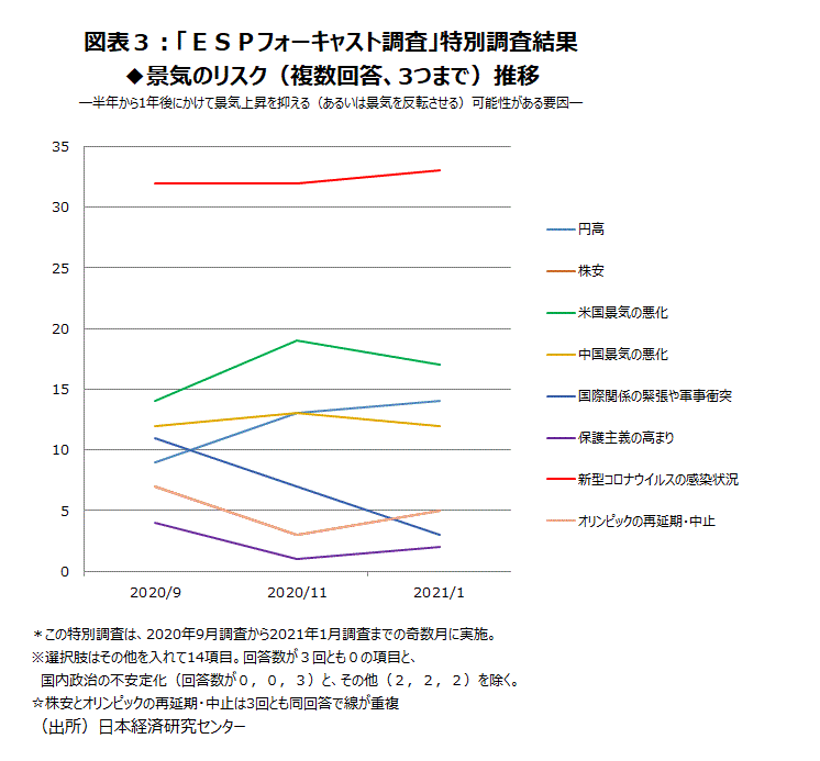 「ESPフォーキャスト調査」(20年9月以降奇数月の特別調査)で景気のリスクとして第2位の「米国景気の悪化」を大きく引き離し、ほとんどのフォーキャスターが指摘したのが「新型コロナウイルスの感染状況」だった(図表3)。