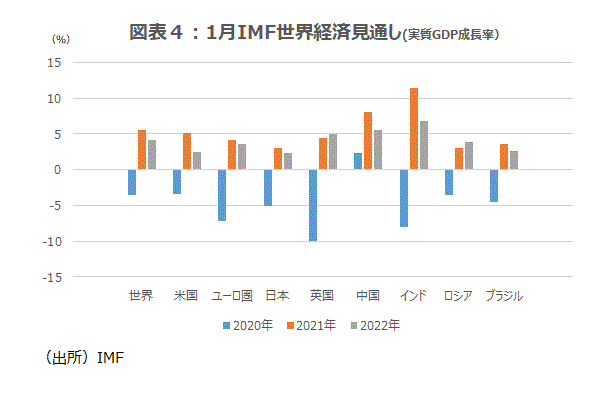 1月26日に発表されたIMF世界経済見通しでは、日本・米国・中国の21年の実質GDP成長率は各々+3.1%、+5.1%、+8.1%だった(図表4)。10月調査から中国は0.1ポイント低下したが、日本は0.8ポイント上昇、米国は2.0ポイント上昇した。日本と米国は昨年末に打ち出された追加経済対策と、21年夏までのワクチン普及を織り込んで上方修正となった。