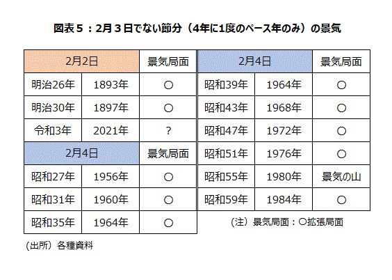 日本最初の資本主義的恐慌は「明治23年恐慌」で、最初の景気循環の拡張局面は1892年(明治25年)11月を谷とし1898年3月を山とみられている。1893年と1897年の19世紀の2月2日の節分は、日清戦争好況を含む拡張局面だった。1956年から1984年まで4年に1度のペースで生じた2月4日の節分が景気後退局面になったことは一度もない(図表5)。 次に、4年に1度のペースで節分が2月3日でなくなるのは2025年。大阪万博開催という景気にとって明るい材料がある2025年の節分は2月2日だ。今年の節分が2月2日だったことはプラス材料だろう。