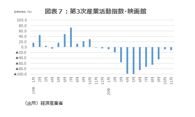新型コロナウイルスの影響で第3次産業活動指数の映画館(ウエイト1万分の2.4)の前年同月比は5月に▲98.7%減まで落ち込み、8月分▲65.2%、9月分▲44.9%と2ケタの大幅減少が続いた。しかし『鬼滅の刃』が10月16日に公開されたことで映画館は息を吹き返し、10月分は▲8.4%、11月分▲11.6%と大きく改善してきている (図表7)。